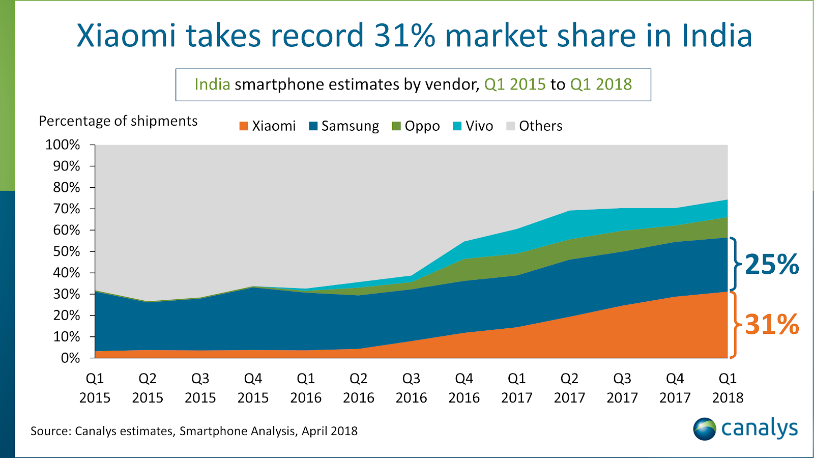 इसलिए, Xiaomi 2018 में सैमसंग से आगे निकलकर भारत का स्मार्टफोन मार्केट लीडर बन गया। लेकिन, 2017 में सैमसंग के 24.7% शेयर की तुलना में Xiaomi की 20.9% बाजार हिस्सेदारी थी।